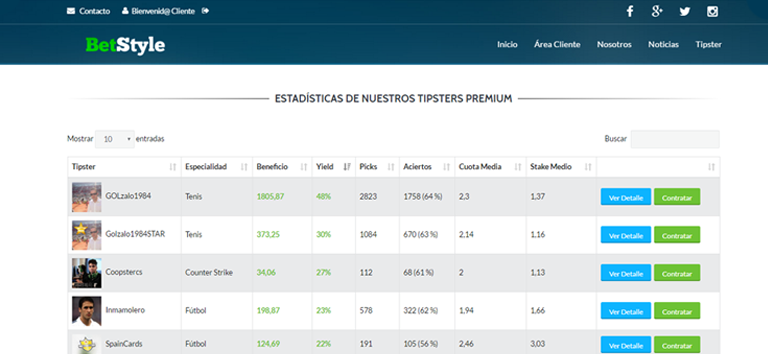 3. Si ya hemos iniciado sesión, accedemos a la sección TIPSTER, desde el menú principal. En ésta sección podremos ver el listado de Tipsters con sus respectivas estadísticas (Especialidad, Yield, Beneficio, etc.). Para conocer más información sobre el servicio de algún Tipster (Descripción, Servicio, Estadísticas por Tipo, Yield Mensual, etc.), haz click en el botón Ver Detalle. Si ya tenemos decidido que Tipster queremos contratar, hacemos clic en el botón Contratar.