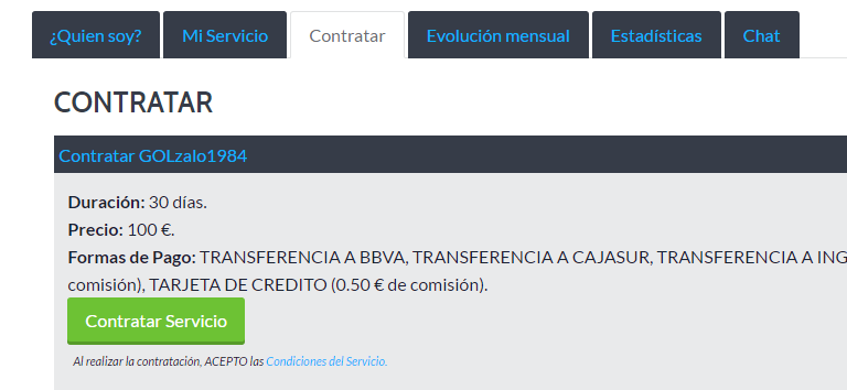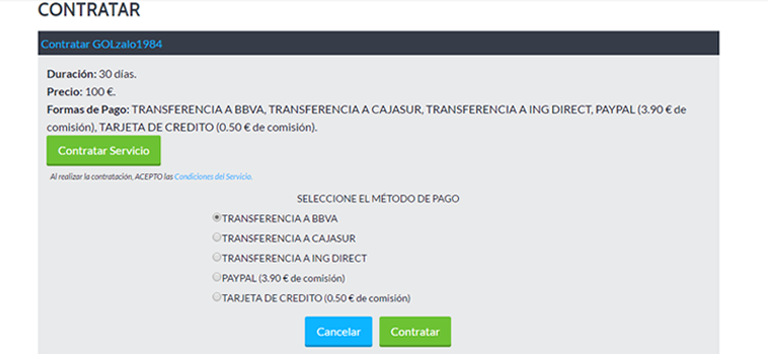 6. Dependiendo del método de pago seleccionado, la contratación quedará activada de forma inmediata o tendremos que esperar a la validación del pago por parte de los administradores, para dicha activación.